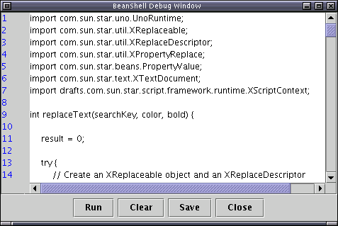 You can modify the code directly in the evaluation window and click eval again to test it. When you are finished making your changes, click Save to save them back to the hello.bsh file. If you are new to the OpenOffice.org API this is a great way to experiment with it.