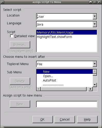 Refresh All Scripts - This is used to refresh the script lists that appear in the Assign dialogs after new scripts have been deployed into your OpenOffice.org installation or documents.